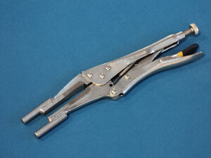 Dale has now come up with this handy new tool making installing and removing the Holeshot DB killer a breeze. These modified locking pliers are equipped with solid pins we hand fit, then precision tig weld to the jaws. They snugly fit in the holes of the DB Killer, then snap tight. This allows you to install the DB Killer, align the mounting bolt hole, and easily remove it even after several heat cycles or carbon build. The Holeshot DB Killer Install / Removal Tool prevents damage or marring up the part, unlike trying to remove the DB killer with needle nose pliers.