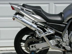 After months of testing Dale's FZ1 high pipe slip-on is now available. It really flows beautifully with the lines of the bike and is arguably the nicest looking FZ1 pipe produced to date. It is hand crafted in-house from high grade 304 stainless and 6061-T6 aluminum. It comes with all stainless clamps - no springs here, and Dales special tapered inlet elbow pipe for maximum flow rate. The high pipe has superior ground clearance is very light weight and retains the center stand with our super clean stop tab. We even designed a special laser cut powder coated hanger bracket that tucks behind the specific 14" high pipe muffler for a ultra clean look. The Holeshot high pipe also allows you to retain or remove the rear foot pegs as well with the provided machined aluminum spacers and hardware in the kit. It is available in fully polished or in our powder black version canisters. The fit and finish is superb and installation is very straight forward.